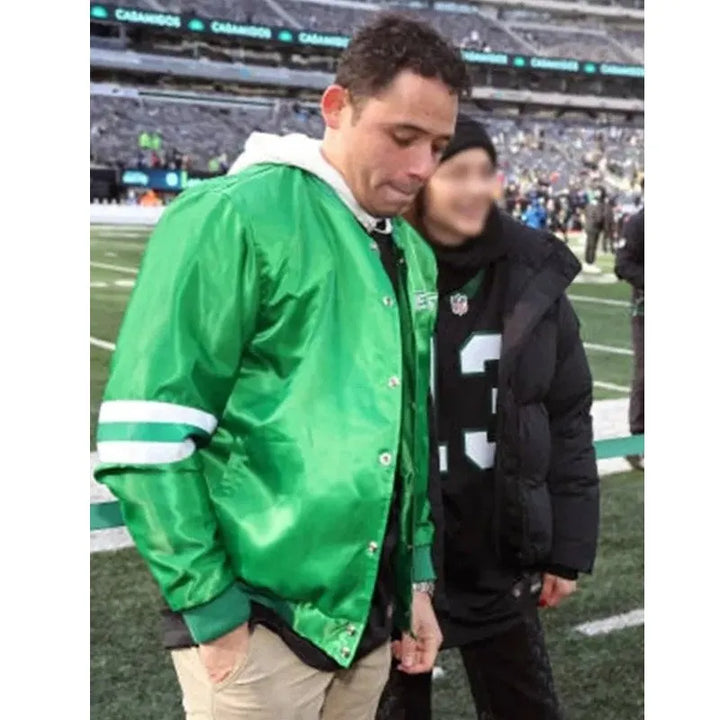 Inspired by Anthony Ramos’ bold look, this green satin bomber jacket blends sporty energy with street-smart style. Its sleek finish, ribbed details, and soft viscose lining make it perfect for game days or casual outings. Lightweight, layer-friendly, and effortlessly cool—this is a standout piece for any wardrobe.