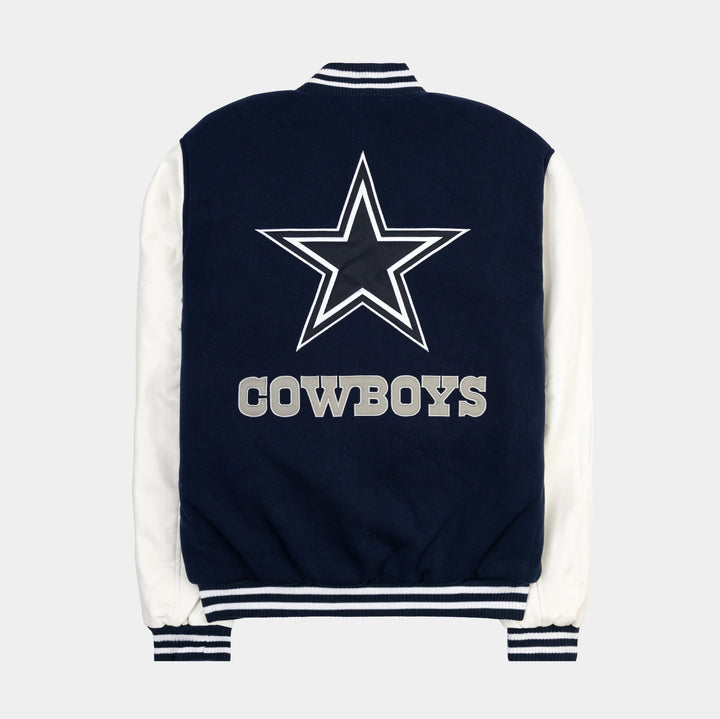 Show off your team spirit in the Dallas Cowboys Letterman Jacket. Crafted with a blue wool body and contrasting leather sleeves, it features a classic snap-button with Zipper front, ribbed collar, and signature Cowboys logos. Perfect for fans who love timeless varsity style.