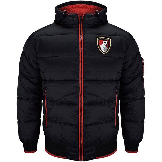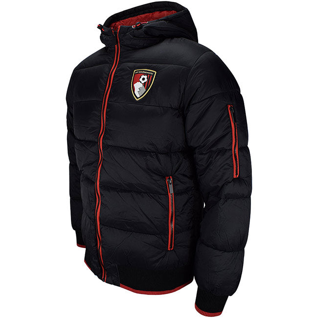 Crafted with a sleek satin outer shell and horizontal quilted stitching, the jacket combines modern design with practical comfort. The Cherry red zip trims and hood lining add a bold splash of club color, while the official AFC Bournemouth crest proudly sits on the chest. With two zipped hand pockets and an additional sleeve pocket for extra storage, this jacket blends functionality with football-inspired fashion.