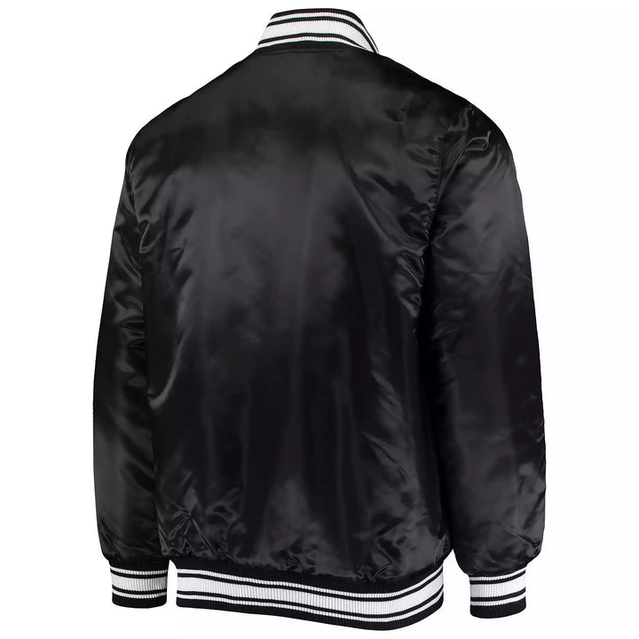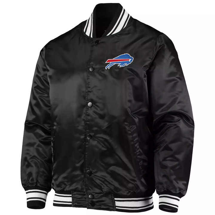 Showcase your Buffalo Bills pride in style, even as the temperatures drop, with the Black Buffalo Bills Locker Room Satin Varsity Full-Snap Jacket, brought to you by The Jacket Seller. Perfect for branded jackets enthusiasts, this classic piece is designed to turn heads with its bold embroidered Buffalo Bills graphics and sleek full-snap closure.
