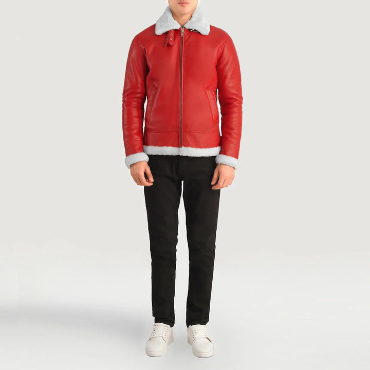 Men's Festive Red Shearling Leather Aviator Bomber Jacket - Luxury Winter & Christmas Gift