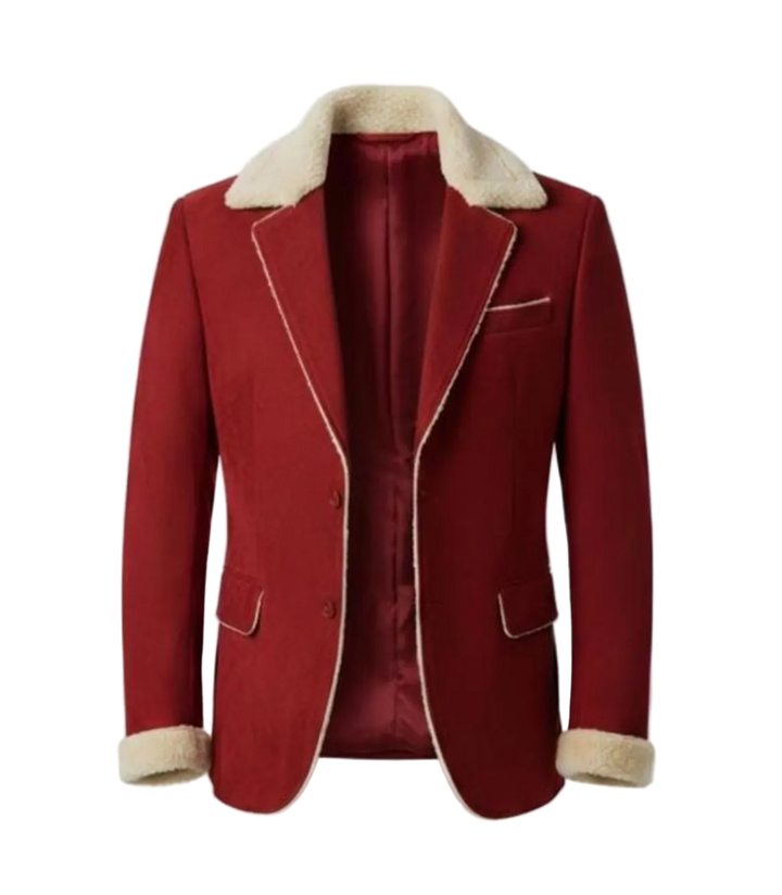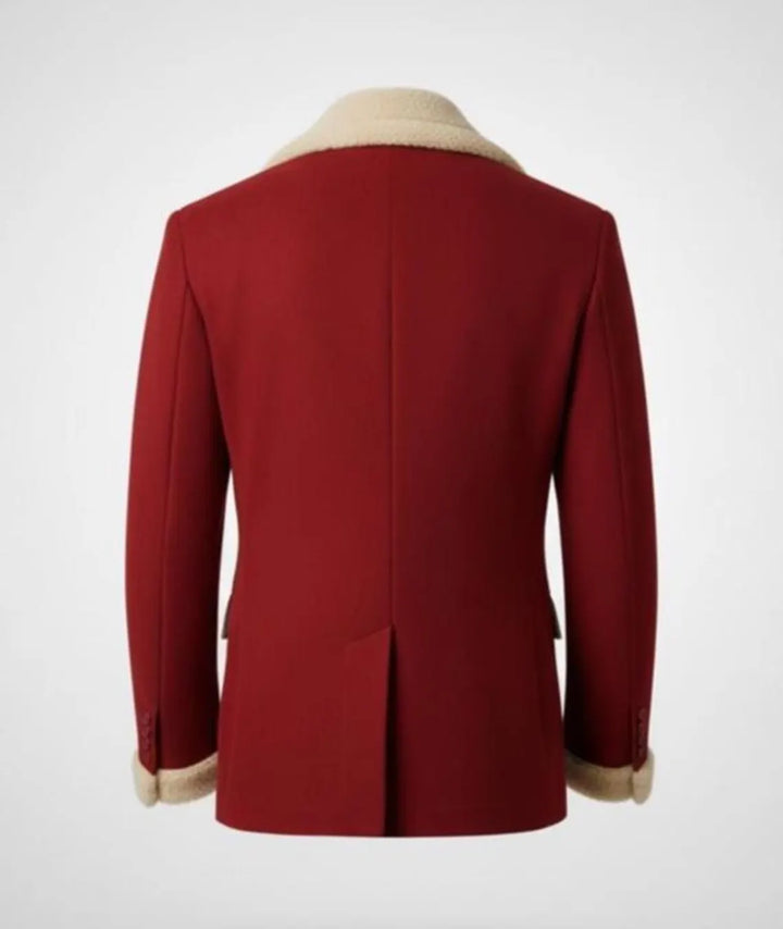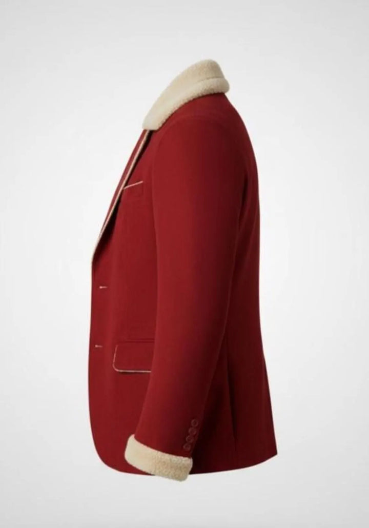 Adorned with plush cream-colored faux shearling on its wide lapel collar and cuffs, this men's jacket captures sophisticated festive charm. Its rich crimson fabric, likely a refined wool blend, creates an immediate visual impact, perfect for making a statement during the holiday season. The design marries classic blazer tailoring with the cozy, luxurious feel of winter-ready outerwear. Subtle cream piping outlines the pockets and front closure, harmonizing beautifully with the soft faux shearling, ensuring a cohesive and elegant look. With its two-button front and practical flap pockets, this piece is not just about aesthetics; it offers a comfortable fit and versatile style that transitions effortlessly from festive gatherings to smart casual events. A single back vent provides ease of movement, making it a functional yet fashionable choice for all your seasonal celebrations.