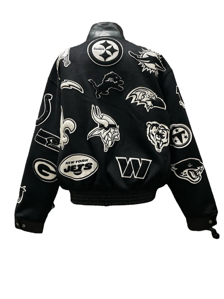 This NFL Collage Leather Jacket is perfect for any football fan. Made from high-quality leather, this jacket features the logos of all your favorite NFL teams. Show off your team spirit while staying warm and stylish. A must-have for any game day!