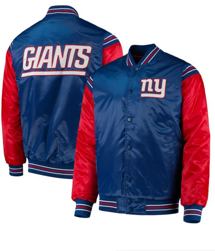 Invest in the ultimate fan's must-have piece with the NY Giants Red and Blue Satin Jacket. Boasting team colors and a sleek satin finish, this jacket is perfect for showcasing your team spirit. Stay warm and stylish while cheering on your favorite team.