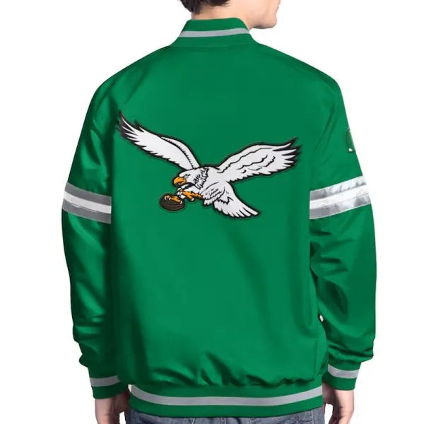Elevate your style with the Philadelphia Eagles Vintage Scout Jacket, a must-have for fans of branded jackets. Expertly crafted by The Jacket Seller, this outerwear boasts a premium satin exterior paired with a moisture-proof viscose lining for unmatched comfort. With its vibrant green, gray, and white color scheme, this jacket mirrors the appeal of a classic green leather jacket.