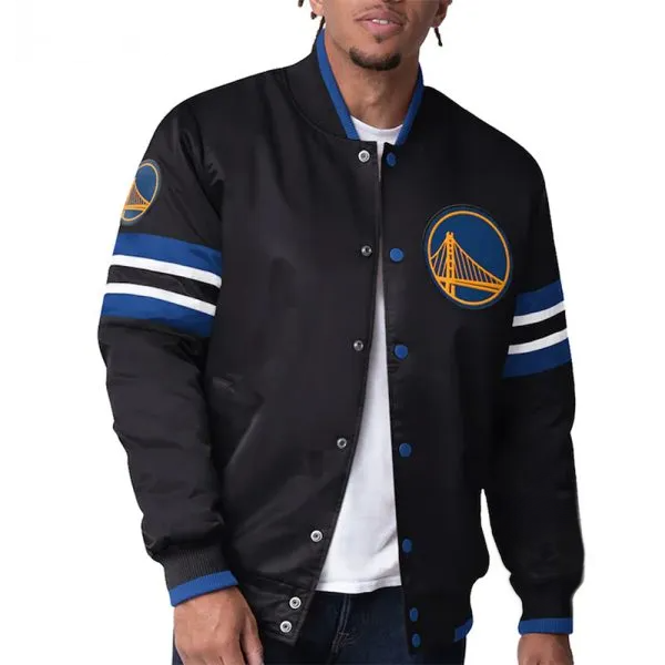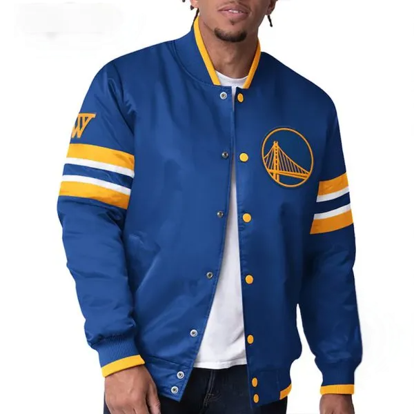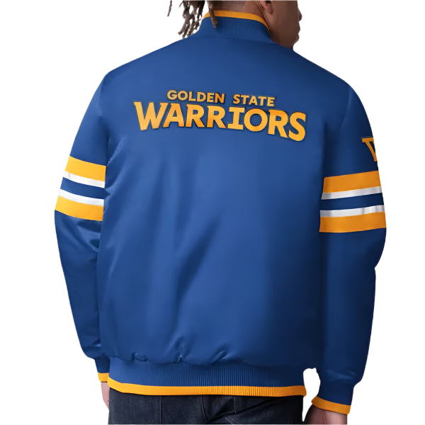 Experience sophistication and team pride with the Golden State Warriors Scout I Jacket, exclusively offered by The Jacket Seller—the ultimate destination for premium branded jackets. Expertly crafted from high-quality satin, this jacket combines style, comfort, and functionality, making it a must-have for every Warriors fan.