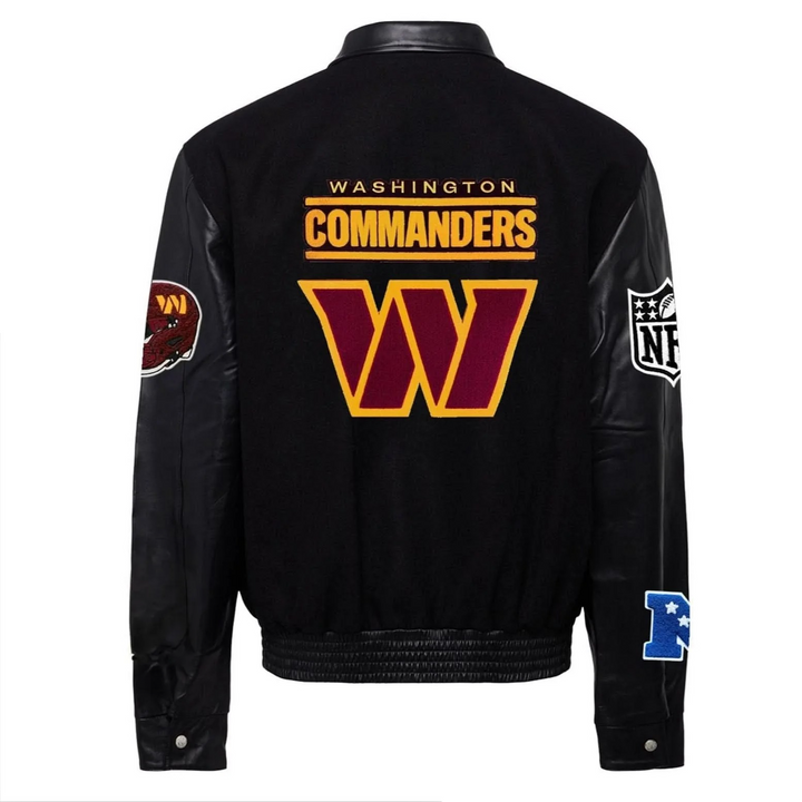 Engineered with premium melton wool body and genuine leather sleeves, this Washington Commanders Varsity Jacket represents exceptional craftsmanship for the dedicated fan. Features authentic team colorway, meticulously Commanders emblems, and technical construction details including reinforced stress points and strategic interior lining. The classic athletic profile with ribbed collar, cuffs, and hem ensures optimal fit retention and thermal regulation. Designed to maintain structural integrity through multiple